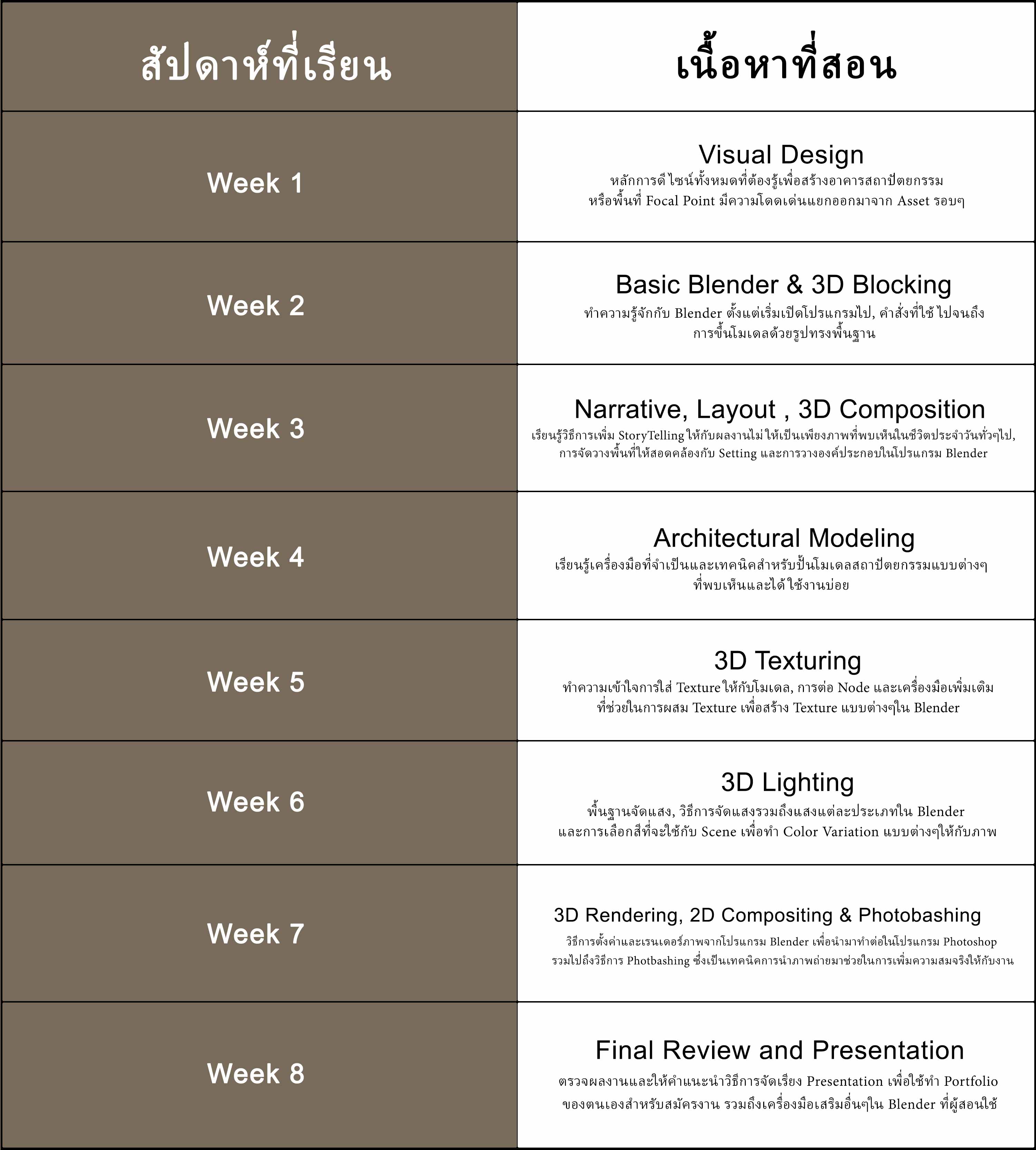 เรียนรู้แนวคิดและกระบวนการออกแบบอาคารสถาปัตยกรรมและสภาพแวดล้อม สำหรับผู้ที่มีพื้นฐานการวาดภาพ 2D ที่สนใจนำโปรแกรม 3D อย่าง Blender ตั้งแต่เริ่มต้น เพื่อมาเสริมประสิทธิภาพ Workflow อย่างเป็นขั้นตอนสำหรับการสร้างสรรค์โลกและฉากของตนเองให้สมบูรณ์ยิ่งขึ้น